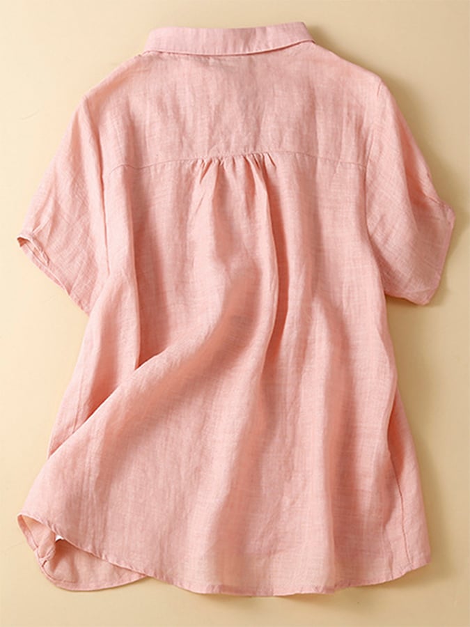 Solid Color Cotton Linen Short Sleeve Lapel Shirt